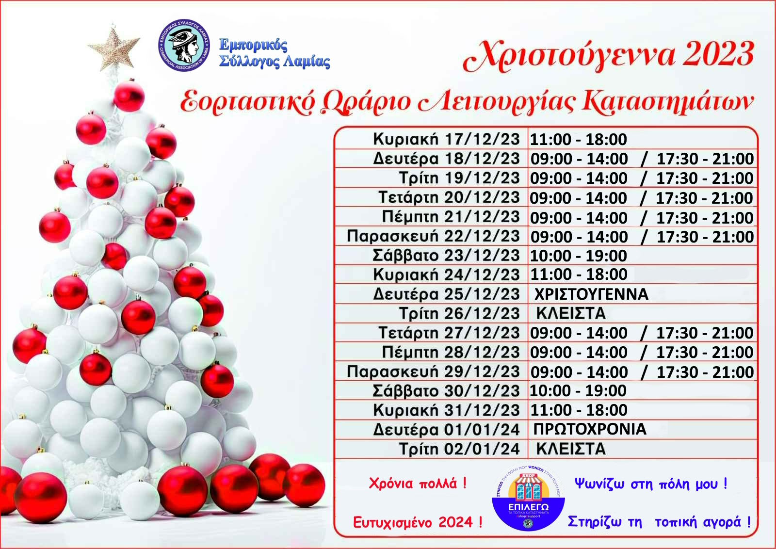 Με γνώμονα την εύρυθμη λειτουργία της αγοράς και την εξυπηρέτηση του καταναλωτικού κοινού ο Εμπορικός Σύλλογος Λαμίας προτείνει το εξής ωράριο :