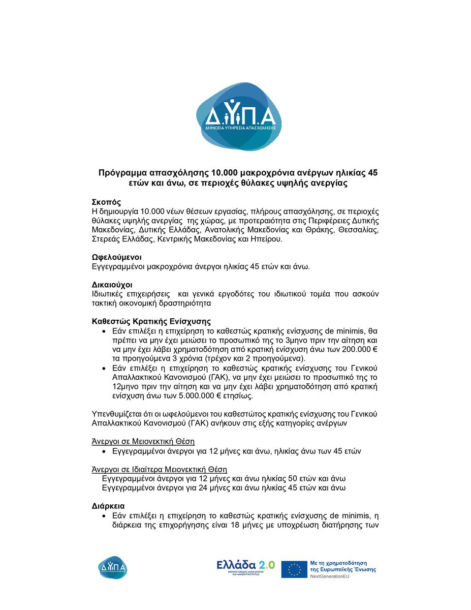 - Πρόγραμμα επιδότησης της εργασίας για 10.000 μακροχρόνια ανέργους 45 ετών και άνω, σε περιοχές θύλακες υψηλής ανεργίας και με συνολικό προϋπολογισμό 120 εκατ. ευρώ. Το πρόγραμμα θα χρηματοδοτεί έως και το 80% του μισθού και των εισφορών για 18 μήνες με υποχρέωση διατήρησης της θέσης για 6 μήνες . Η μέγιστη επιχορήγηση ανέρχεται σε 13.709 ευρώ ανά θέση εργασίας, ενώ προτεραιότητα θα δοθεί σε επιχειρήσεις της πράσινης και ψηφιακής οικονομίας.