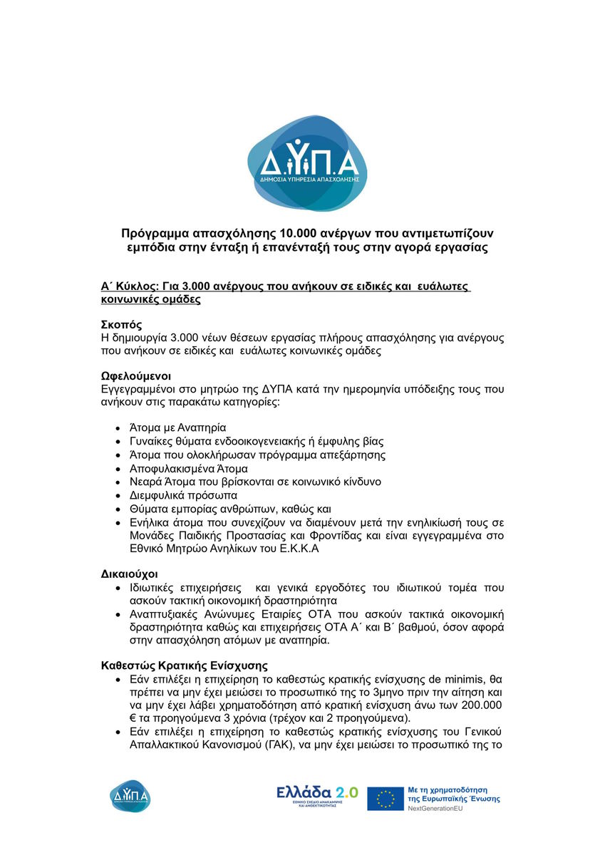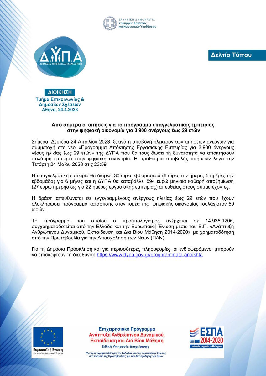 Θα θέλαμε να σας ενημερώσουμε ότι έχουν προκηρυχθεί τρία (3) Νέα προγράμματα απασχόλησης από τη Δ.ΥΠ.Α.